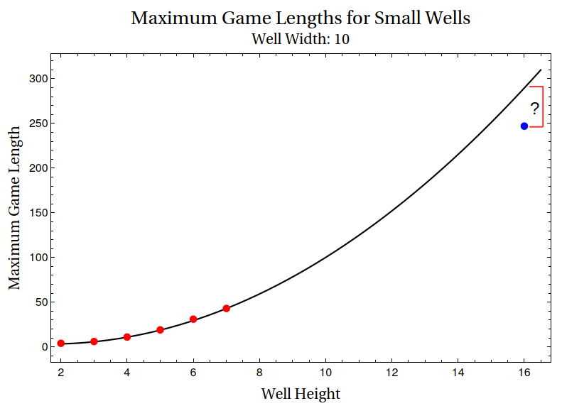 Going back to the analysis on smaller wells, the length of the best possible games seems to increase approximately quadratically. Fitting a quadratic function to the results from well heights 2 through 7 and extrapolating out (and taking the result with a grain of salt), we’d expect the best possible game to last about 290 moves, which, like the previous estimate, would correspond to a best possible score of 102-103 - at the very least, indicating again that the current record is not the best possible game.