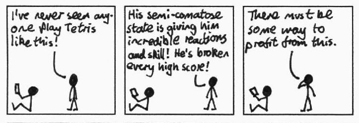 It’s a common experience for players to try the game for the first time with a strategy perfectly sound for normal Tetris and score no points at all, simply because normal Tetris strategy amounts to setting up good situations and then waiting for the odds to be in your favor. With a deterministic algorithm like this one, the odds will never be in your favor.