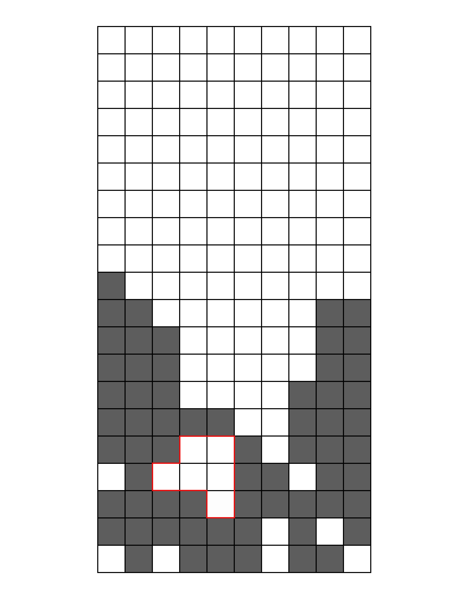 First we considered this: given a specific height, there is a finite set of possible positions that fit within that height. (for example, the height 1-4). These positions are not independent of each other. That is to say, if one piece position is blocked due to a filled square, some other piece positions will be blocked as well. For a given four-line area in the grid, there is a limited subset of potential positions for a piece, considering all rotations and positions within that space. In fact, for every piece except the O piece, there are 34 possible positions (including rotations) in a 4 x 10 area.
