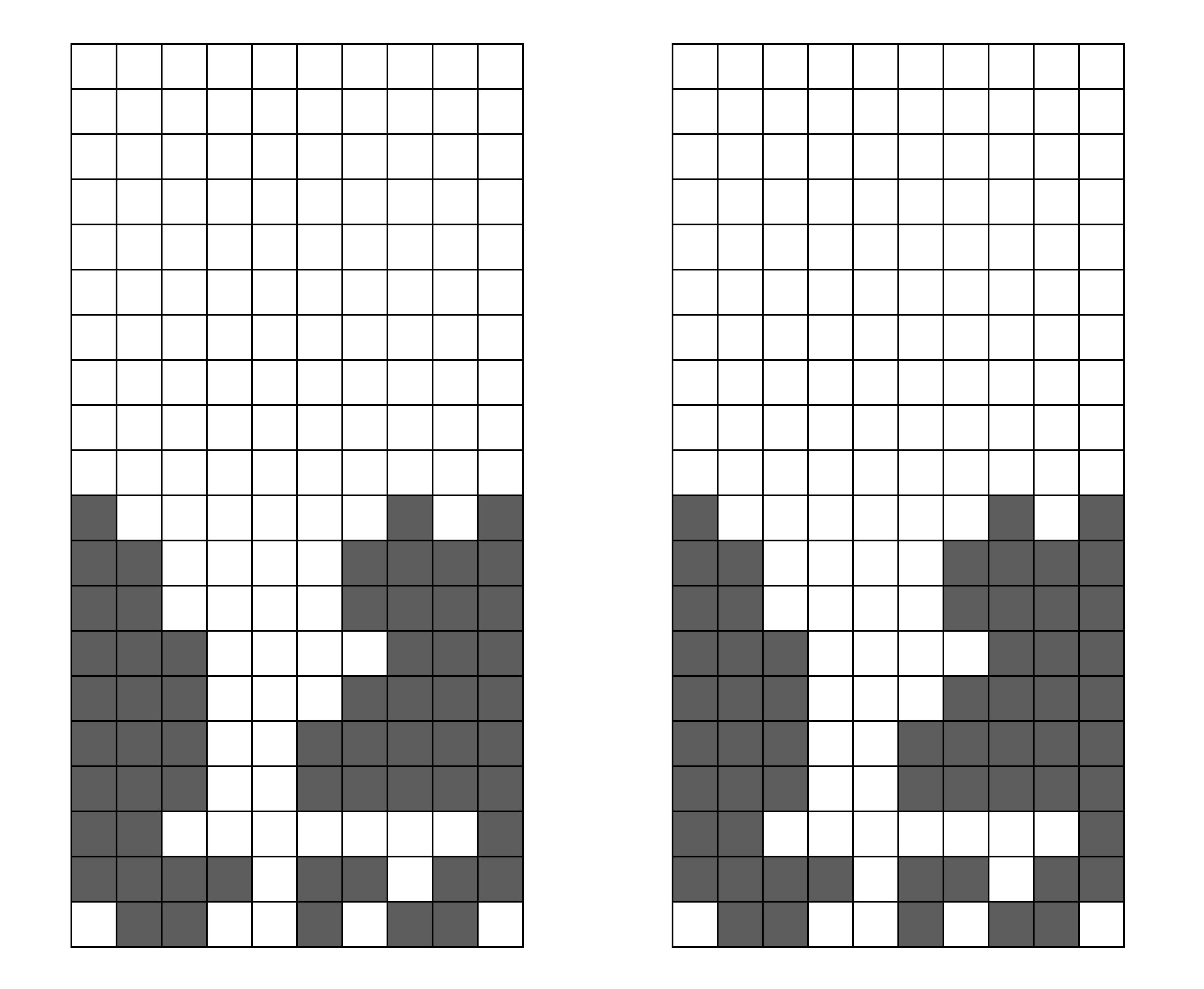 Commenter Atypical posted the first replay, an eleven-point run, and over the next month, the high score was pushed to 17, 20, 22, 28, and finally 30, all using the same opening sequence of moves to create wells where every piece can be used to clear a line, four or five times in a row. This sequence of moves was so successful, in fact, that every world record run for ten years after its discovery used it. The Atypical strategy consisted of stackingS-pieces to the left of the well, clearing as many lines as possible, building a flat ‘ceiling’ on top of the pieces currently in the well, and then effectively starting from scratch on top of that ceiling. By the time of the 30-point runs, the Atypical strategy was so successful that it was even done a third time, near the end of the game. So far as we know, there isn’t a term for this, so we call this a pseudoloop; you’re not getting back to the same well you had before, but you’re doing the same pattern over and over again.