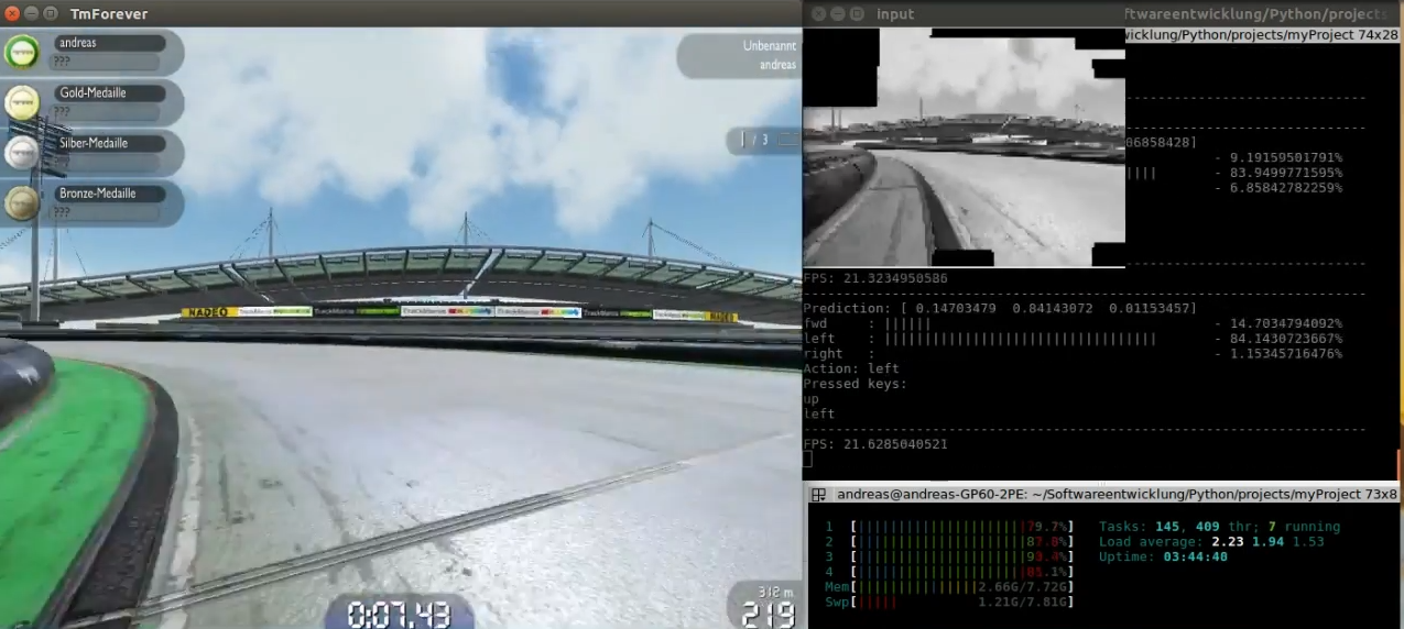 The earliest attempt we know of at a self-driving car in Trackmania was from 2017, by a German software developer named Andreas Rottach (going by Rottaca), who published the code on GitHub. The idea was supervised learning: take examples of cars driving well, take screenshots throughout the game, label the screenshots with the keys (left, right, or neither) which were being hit at that moment, and train the network to hit the appropriate key when given the appropriate screenshot.